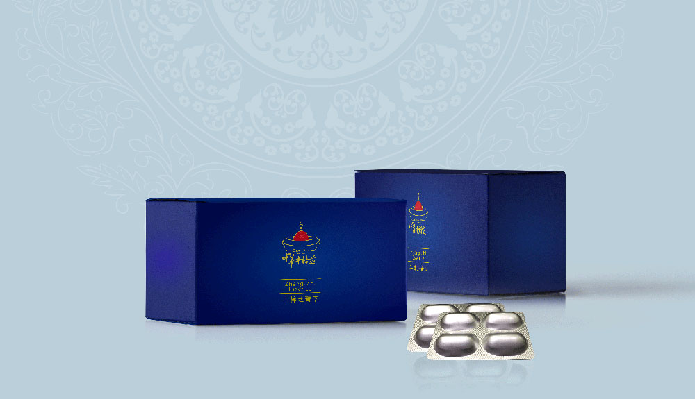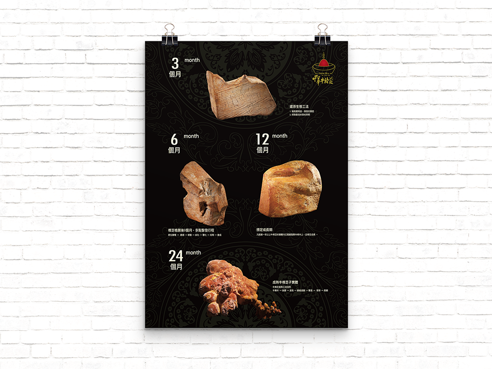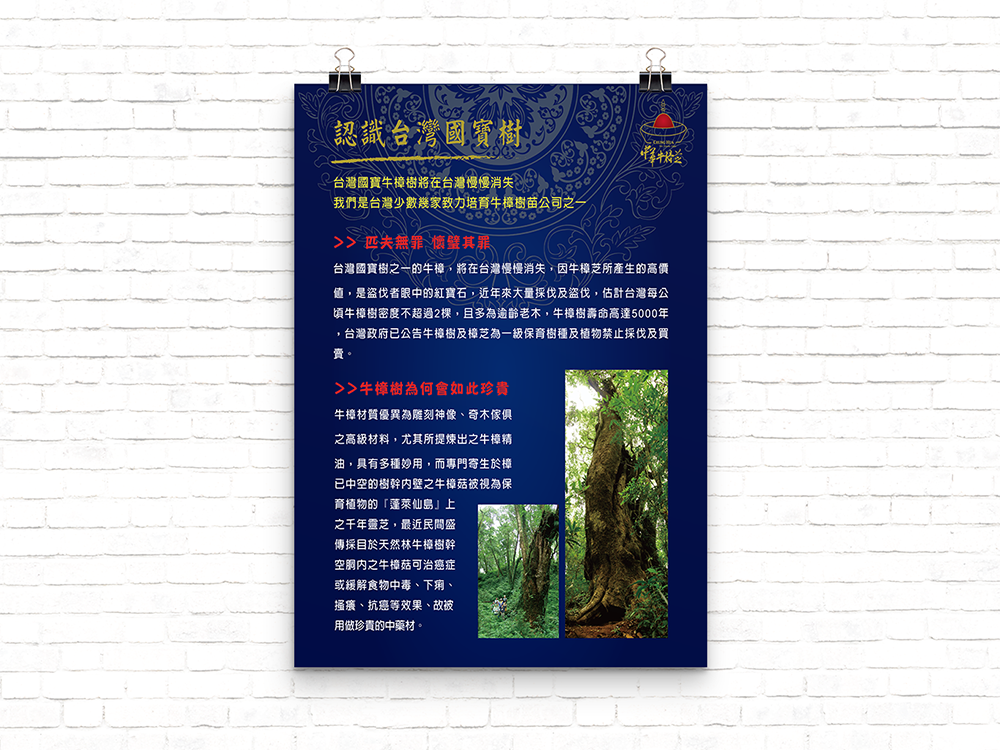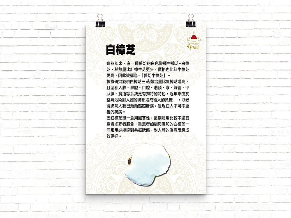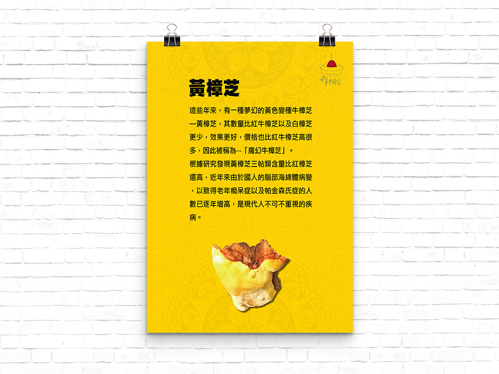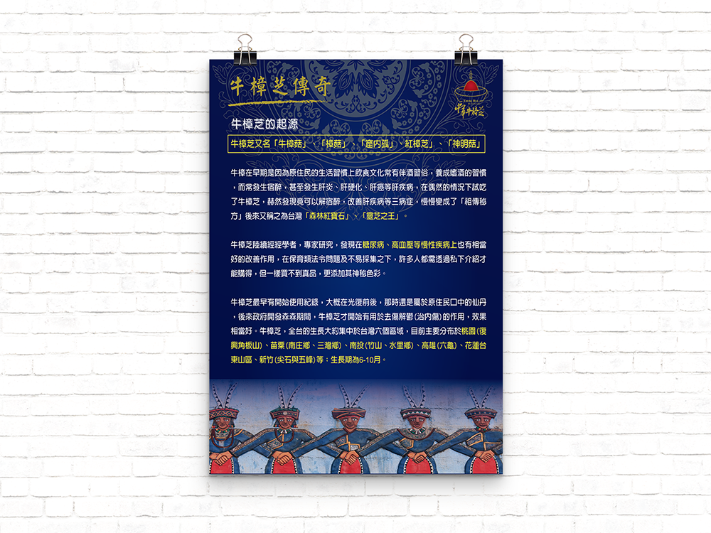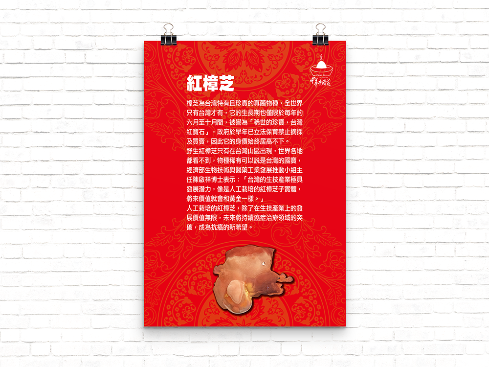 「中華牛樟芝」標誌取自皇帝頭冠造型,並加以拆解、簡化與重新組合,表現皇室貴氣血統與稀有牛樟芝相互提升品牌質感,將品牌相互融合企業理念精神。