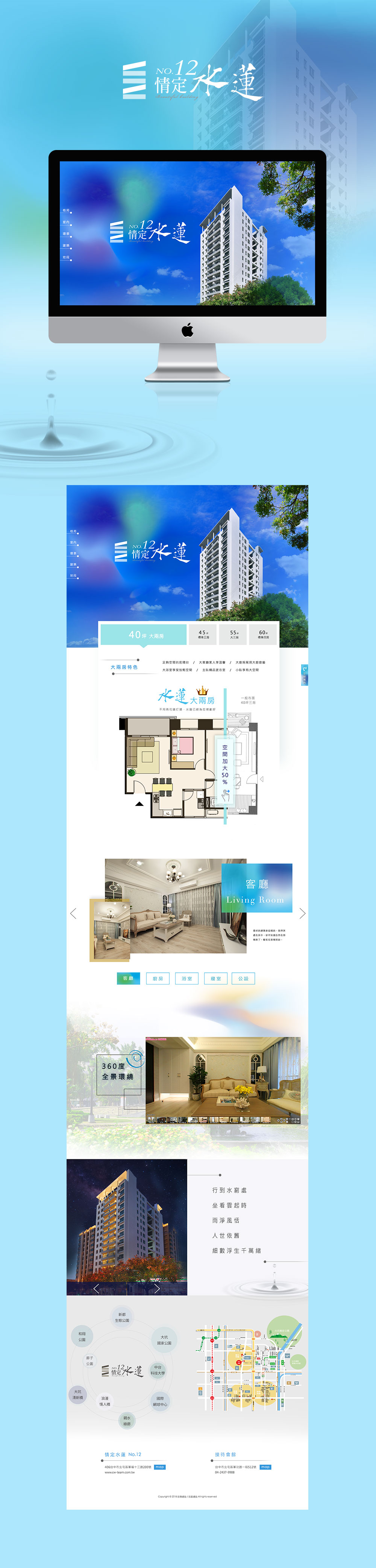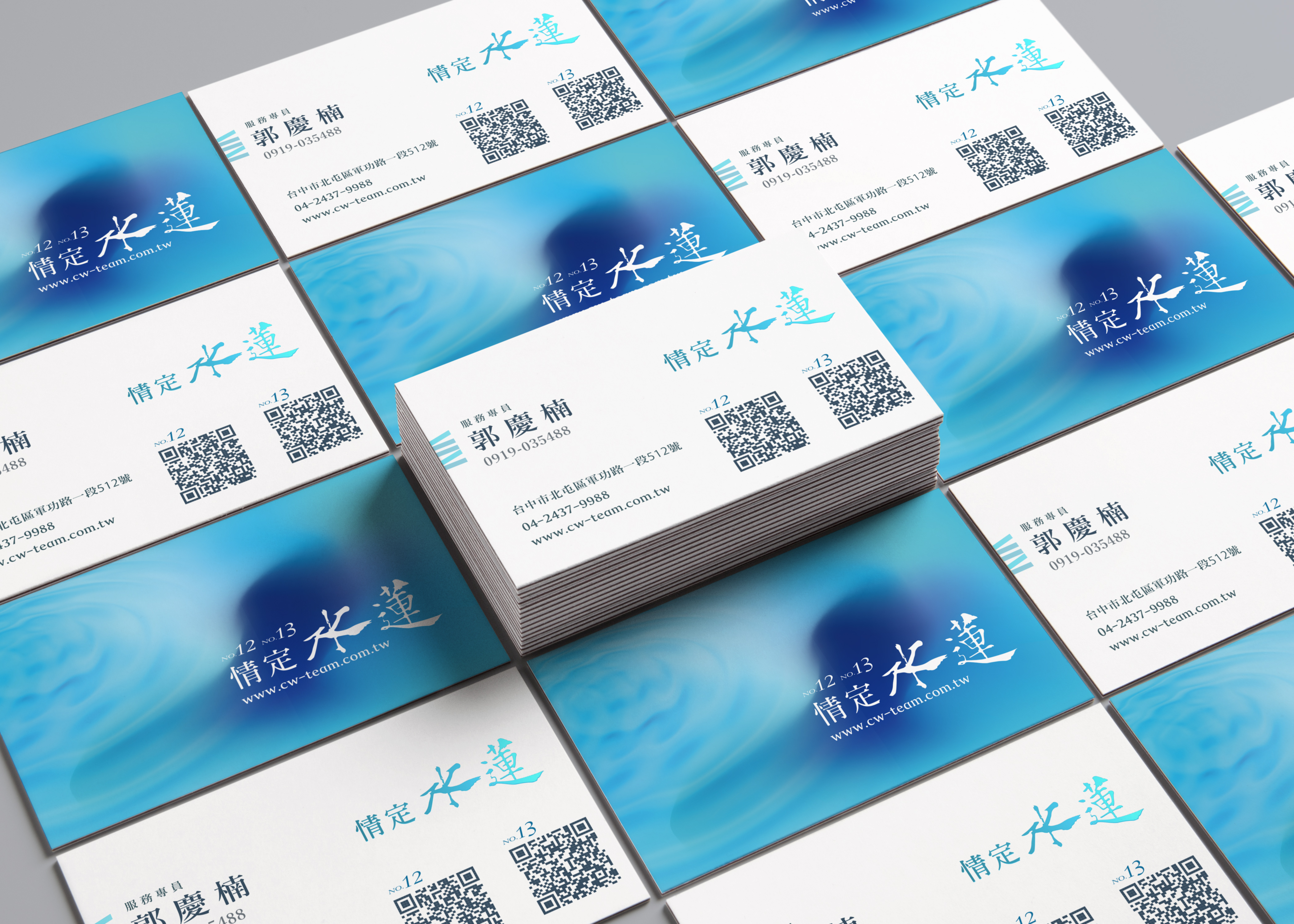 辰偉建設的情定水蓮12期 這一波宣傳期視覺運用藍綠色加上一點光暈的效果比較親切,藍綠色展現現代時尚,不受年齡所限制比較中性的色調。 名片運用細蚊紙增加名片觸感,運用燙藍金,呈現水波波光粼粼的視覺效果。