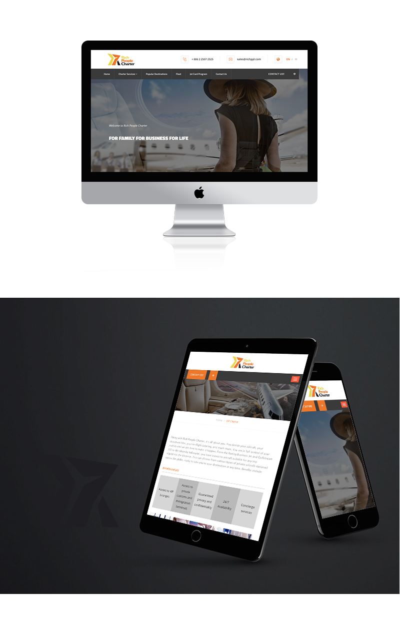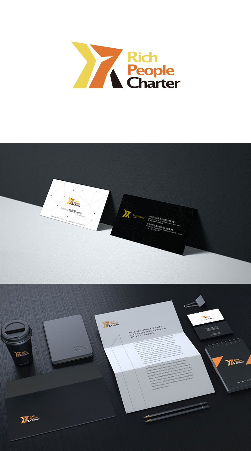 灣捷提供私人飛航的服務,順利讓客戶完成商務洽公或享受旅遊休憩時光。因此將灣捷以金字塔頂端客戶定位,以橘黃色為主色,將Logo結合品牌精神「R」「飛機的螺旋槳」及「人」的概念,並以精品為形象走向,發展一系列企業識別應用。